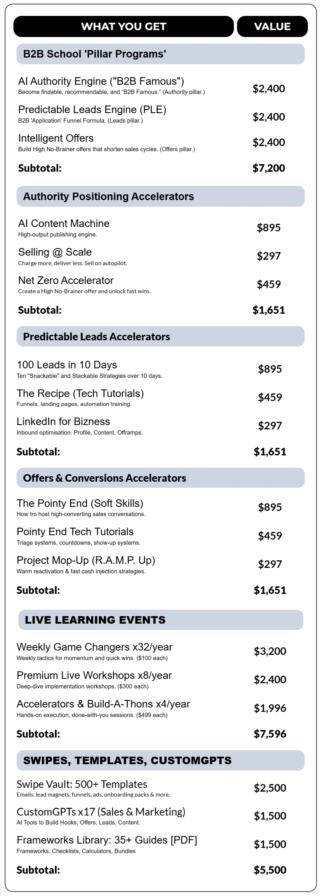 The B2B School is for serious players (like you) who want to codify their expertise, generate leads predictably, and close clients faster. The principles apply across industries, but we’ll also tailor guidance to your unique offer.